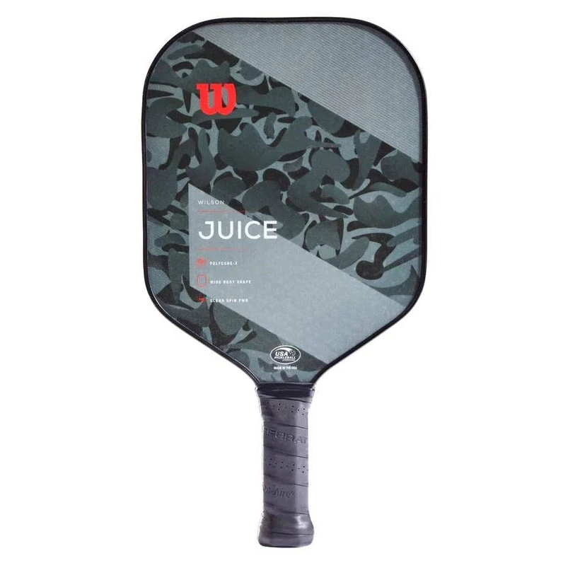 Delivering an appealing combination of clean design and sheer power, the Wilson Juice Camo paddle introduces a new wave of paddle performance to the pickleball court. The Juice features a printed spin tech on the paddle surface that increases ball rotation off the paddle surface, giving players the confidence they need to be aggressive with powerful shots when the situation warrants it. Sporting a wide body shape for a generous sweet spot and a core that impressively dampens vibrations, the USAPA-approved Juice feels great and performs even better.
